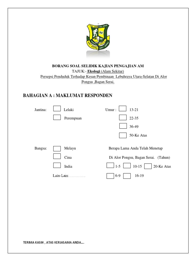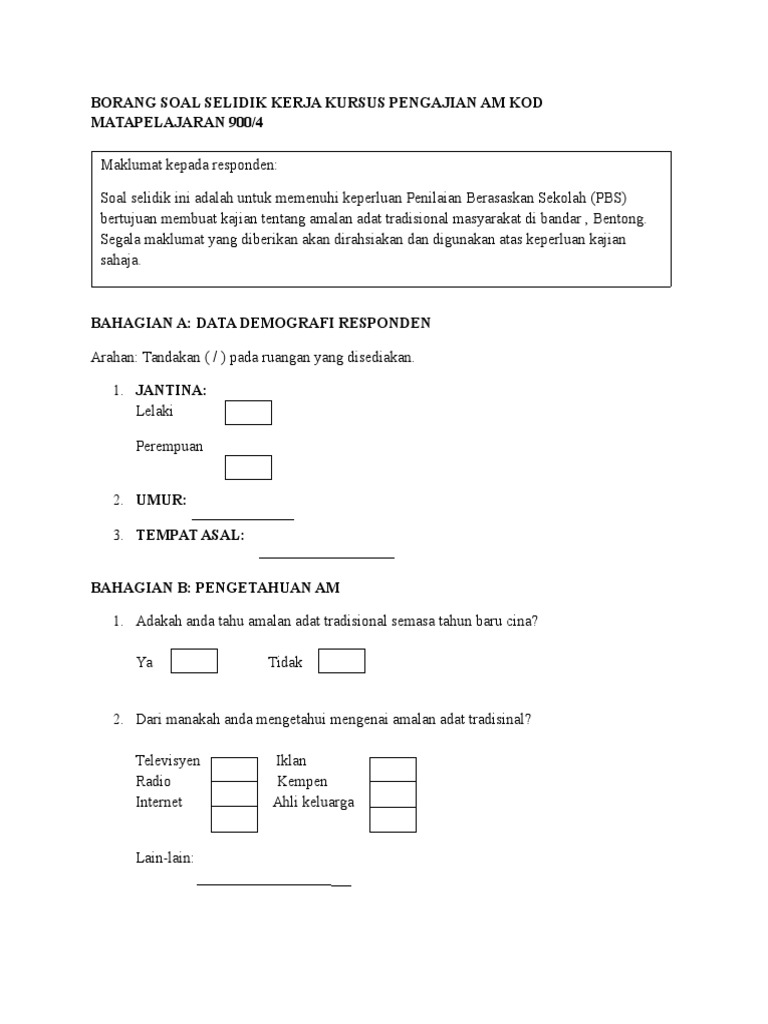 Akhir sekali penghargaan juga diberikan kepada semua responden yang sudi menjawab soalan soal selidik. Soal Selidik Tentang Adat Resam. Contoh borang kaji selidik pengajian am.